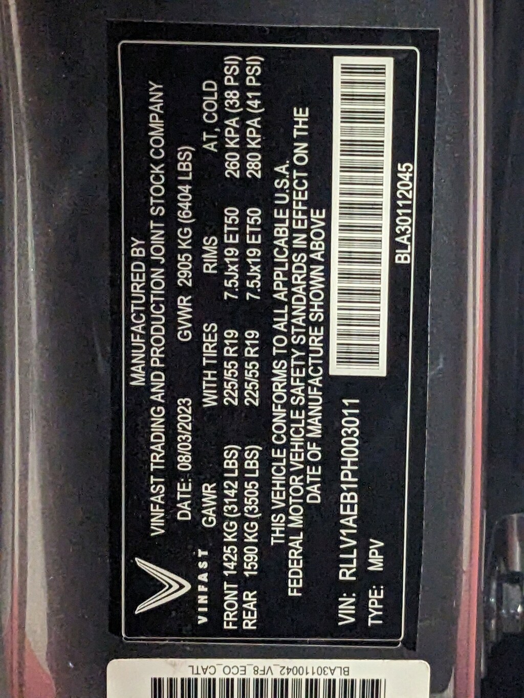 - Rear tires: 225/55VR19.0